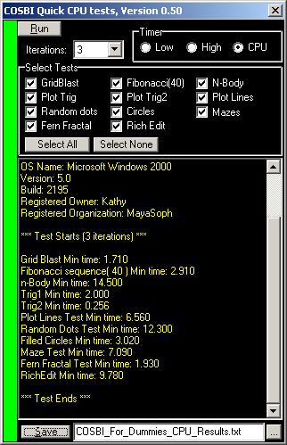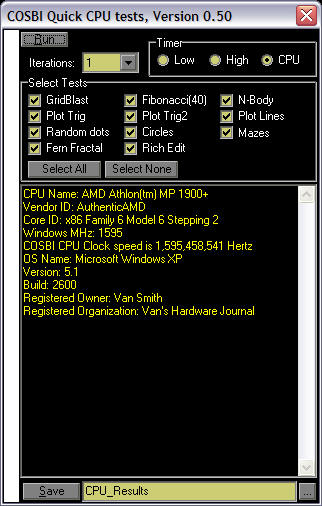 To run the program, you insert the floppy disk and double-click on the COSBI_QuickTest.exe file. When the COSBI Quick CPU test window appears, click on the drop-down box next to iterations to select the number of iterations you want to run for each test. Click on the Run button in the upper left hand corner of the window to start the test.