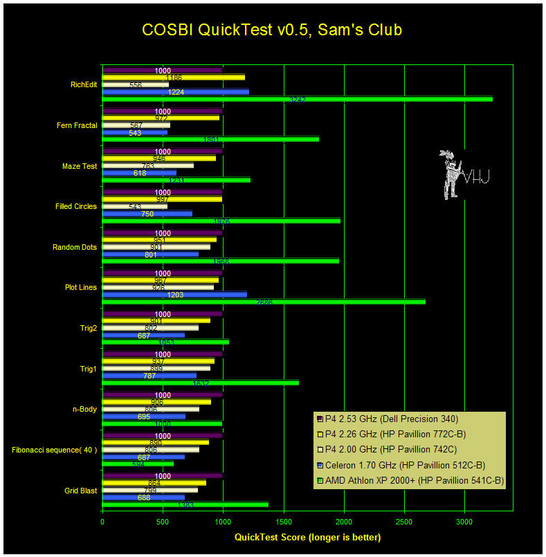 I ran COSBI on four different computers at Sam's Club. For each test in the application, I ran 3 iterations of the test. The results were then normalized against a Dell P4 2.53 GHz (Dell Precision 340) in the graph below. The Dell Precision 340 computer uses NVIDIA Quadro2 EX (32 MB) graphics. The specifications and prices for the other computers in this graph are listed in the section Computer Configurations.